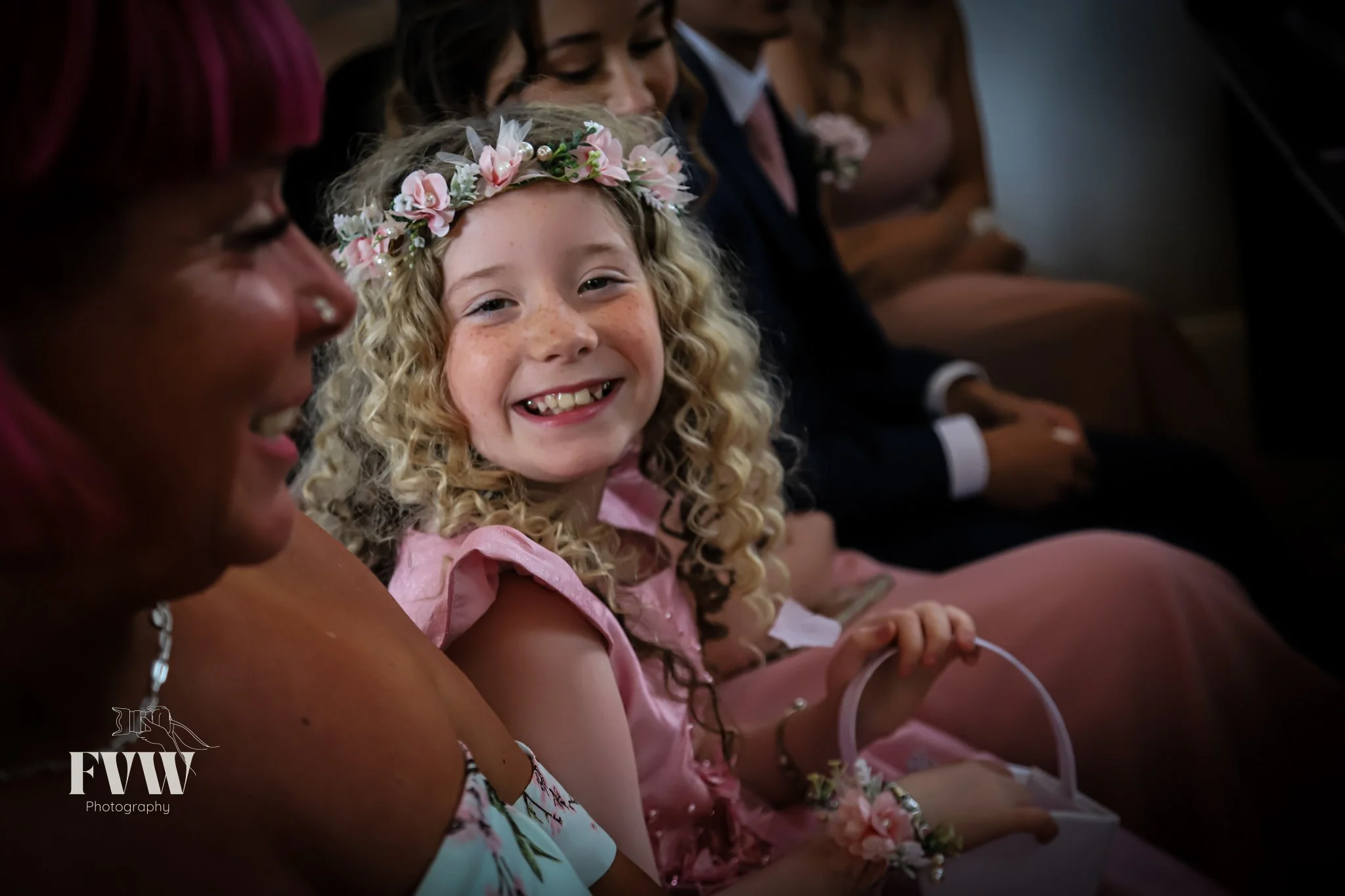 A young girl with curly blonde hair, a floral headband, and a pink dress, smiling at a wedding ceremony, sitting in a row with other guests.