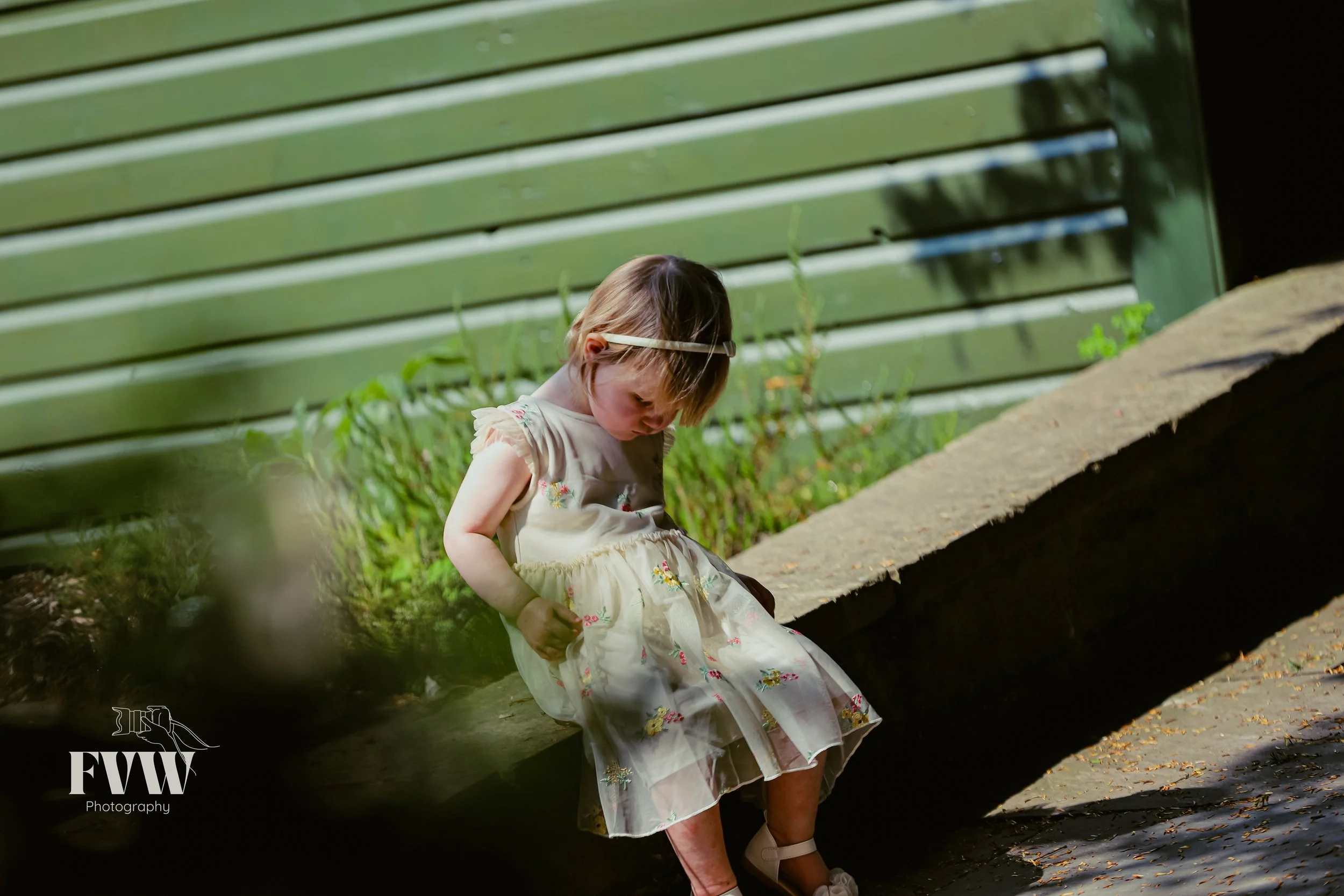 A young girl with brown hair, wearing a cream-colored dress with floral embroidery and white sandals, is sitting under a bench in the sunlight, looking down with a contemplative expression.