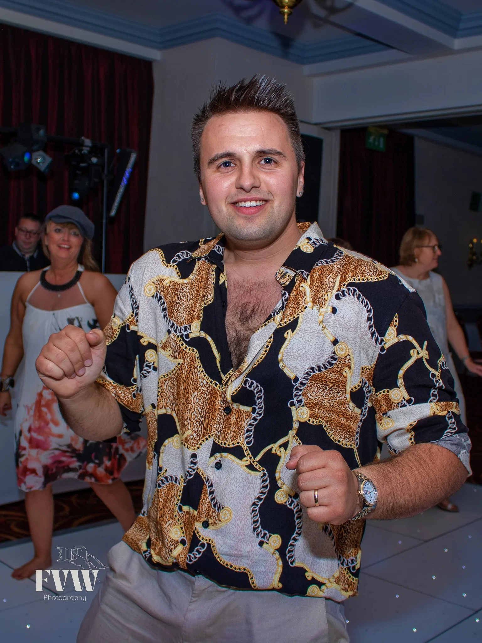 A smiling man in a patterned shirt with clasped fists at a party or dance event, with two women dancing in the background.