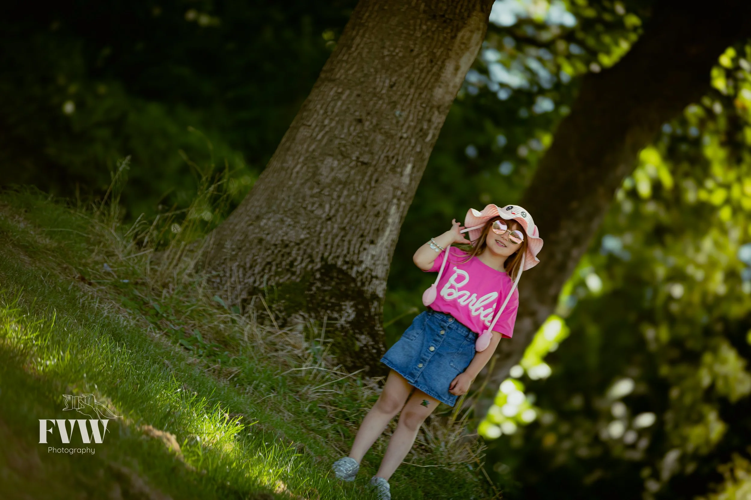 A young girl stands outdoors leaning against a large tree trunk, wearing a pink t-shirt with 'Barbie' written on it, a denim skirt, sunglasses, and a wide-brimmed hat, smiling and holding her hat's brim.