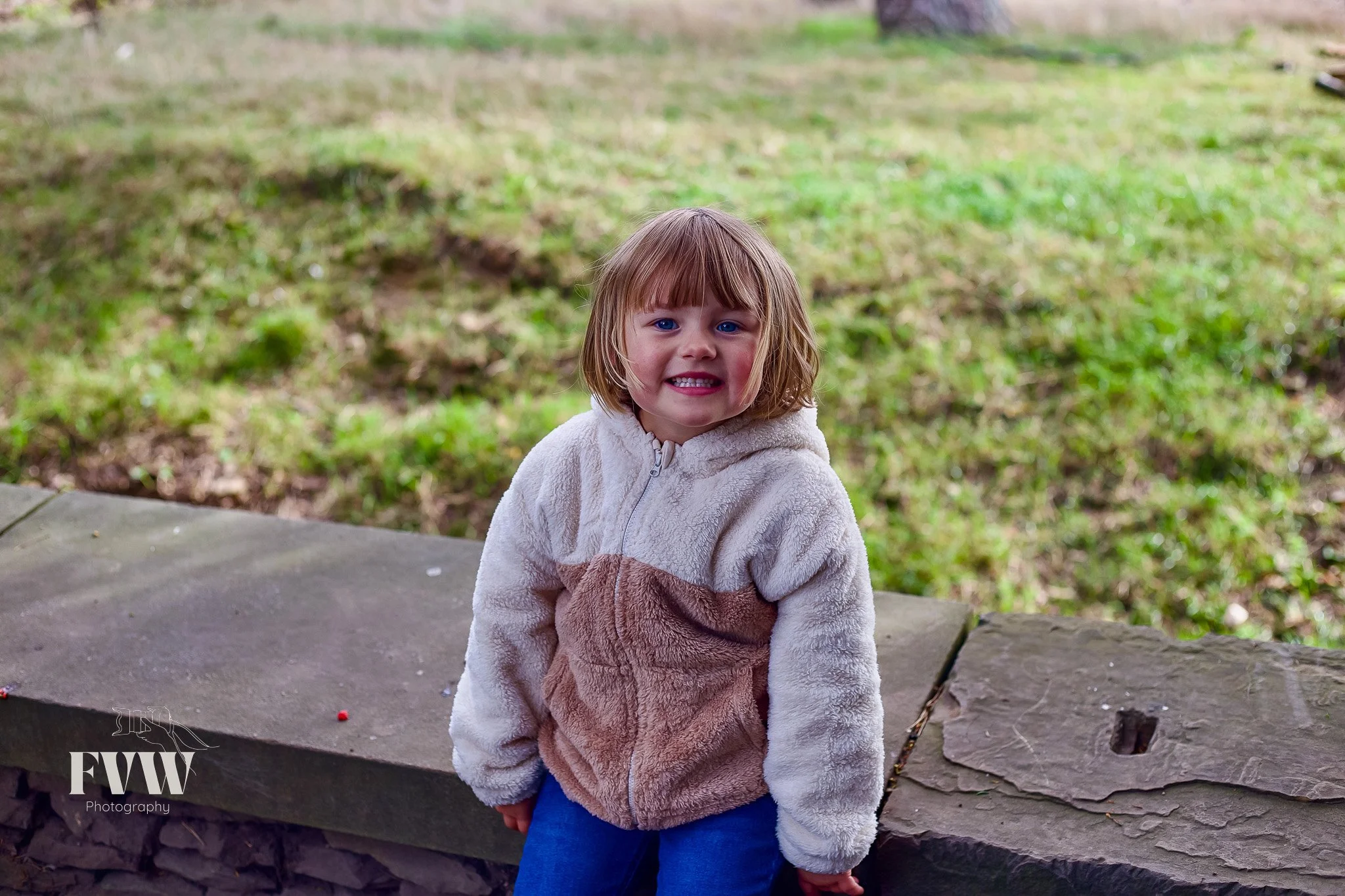 a young girl with shoulder-length light brown hair, blue eyes, and a big smile, wearing a fuzzy beige and brown jacket and blue pants, standing outdoors next to a stone ledge with a grassy area in the background
