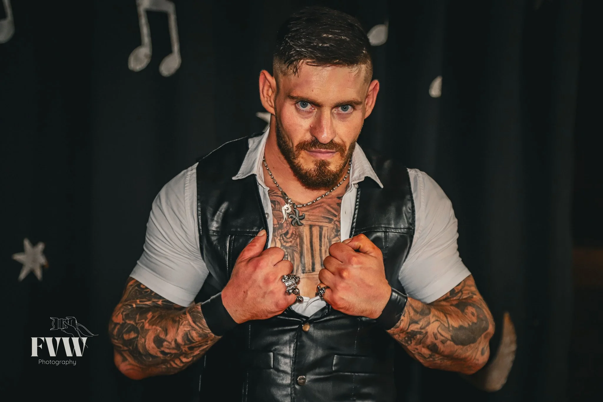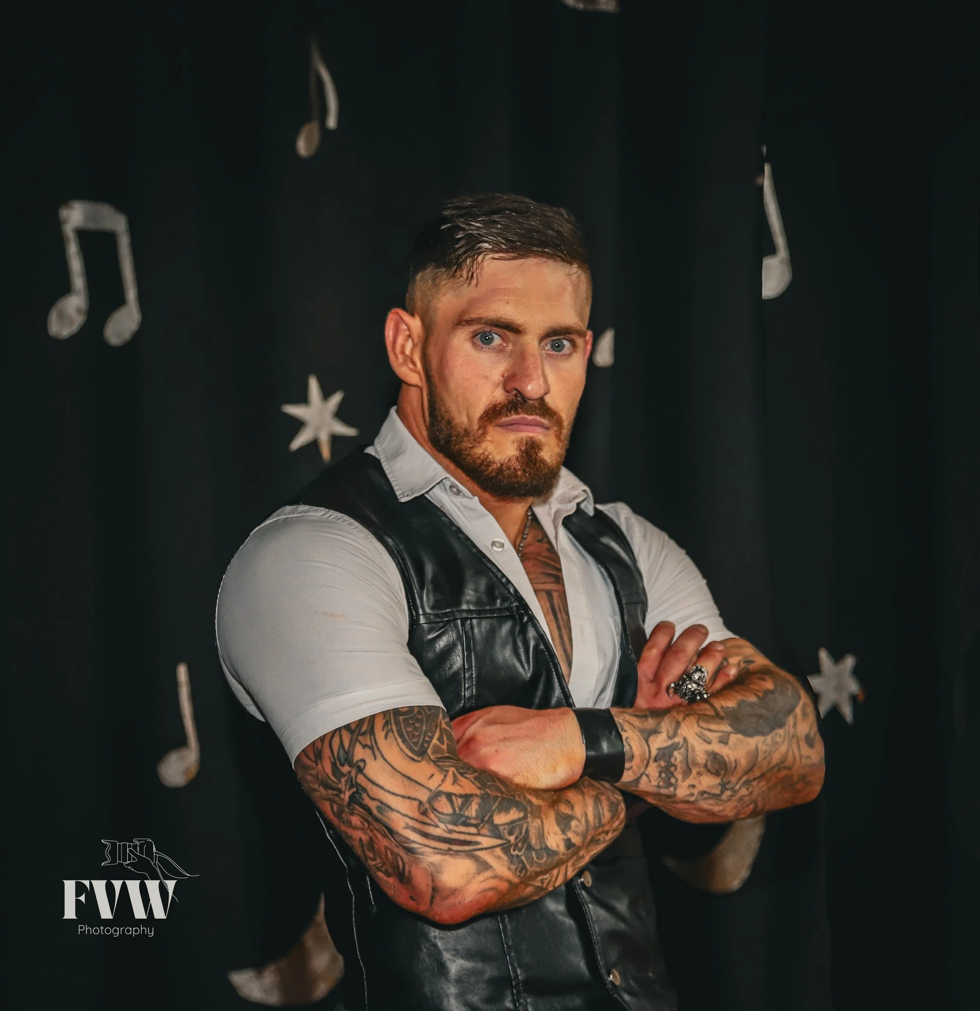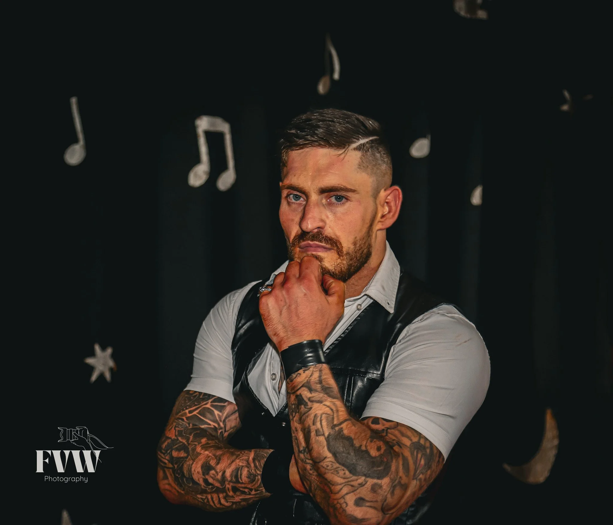 A shirtless man with tattoos, wearing a black leather vest, jewelry, and fisted hands, looking confidently at the camera against a dark background with music note decorations.