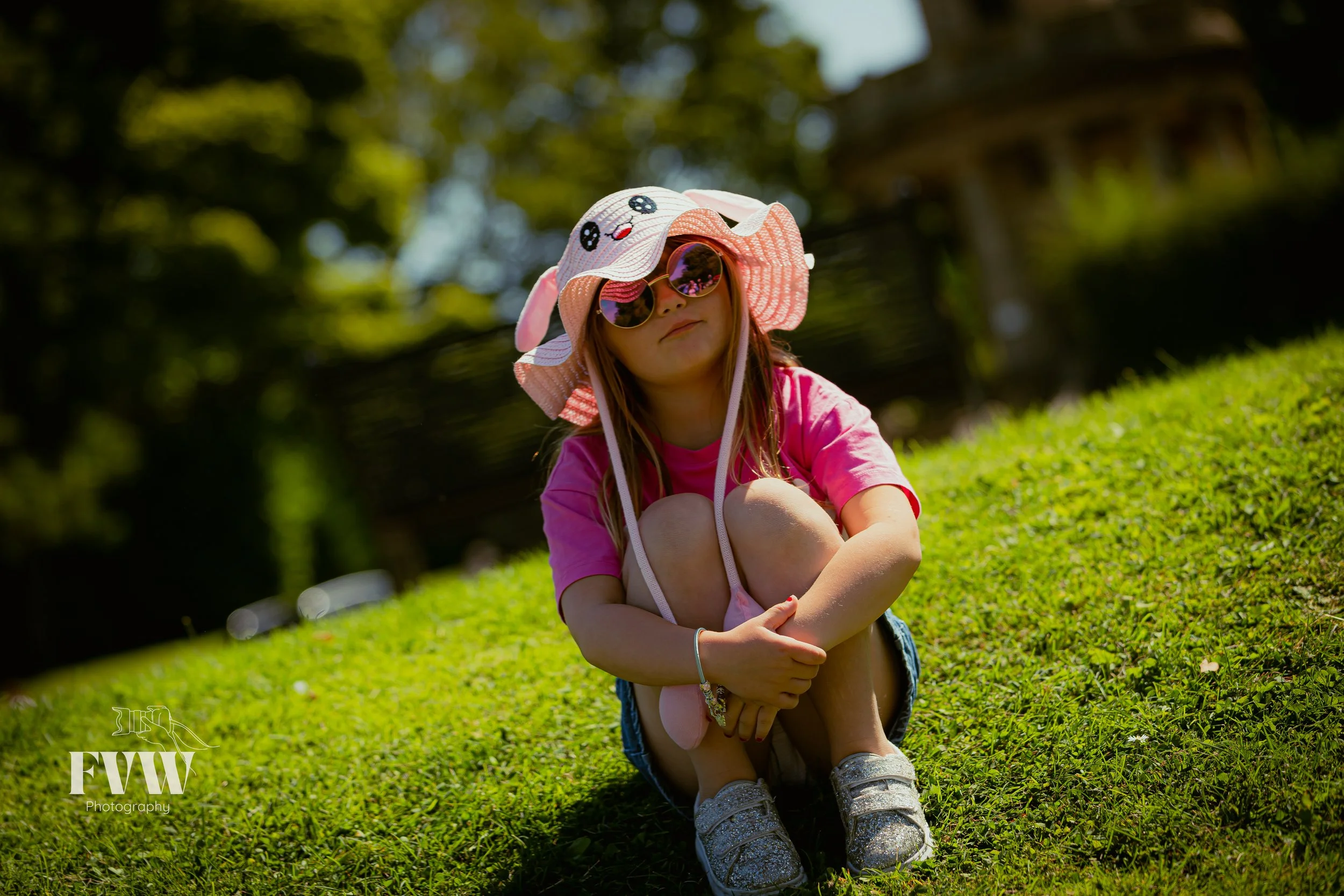 A young girl sitting on grass in a park wearing a large, floppy pink and white bunny hat with cute animal face on the front, pink sunglasses, a pink T-shirt, and glittery sneakers.