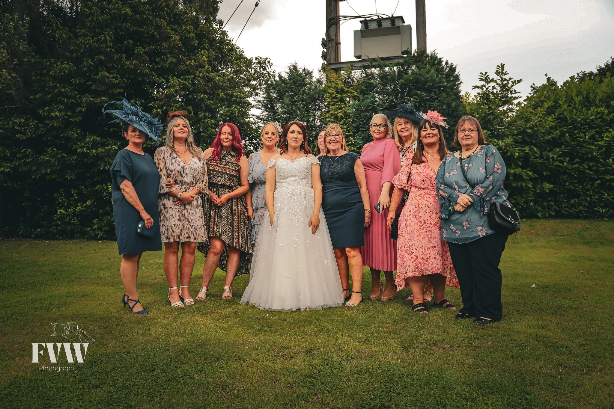 Group of women, including a bride in a white wedding gown, posing on a grassy area outdoors with trees in the background during a wedding celebration.