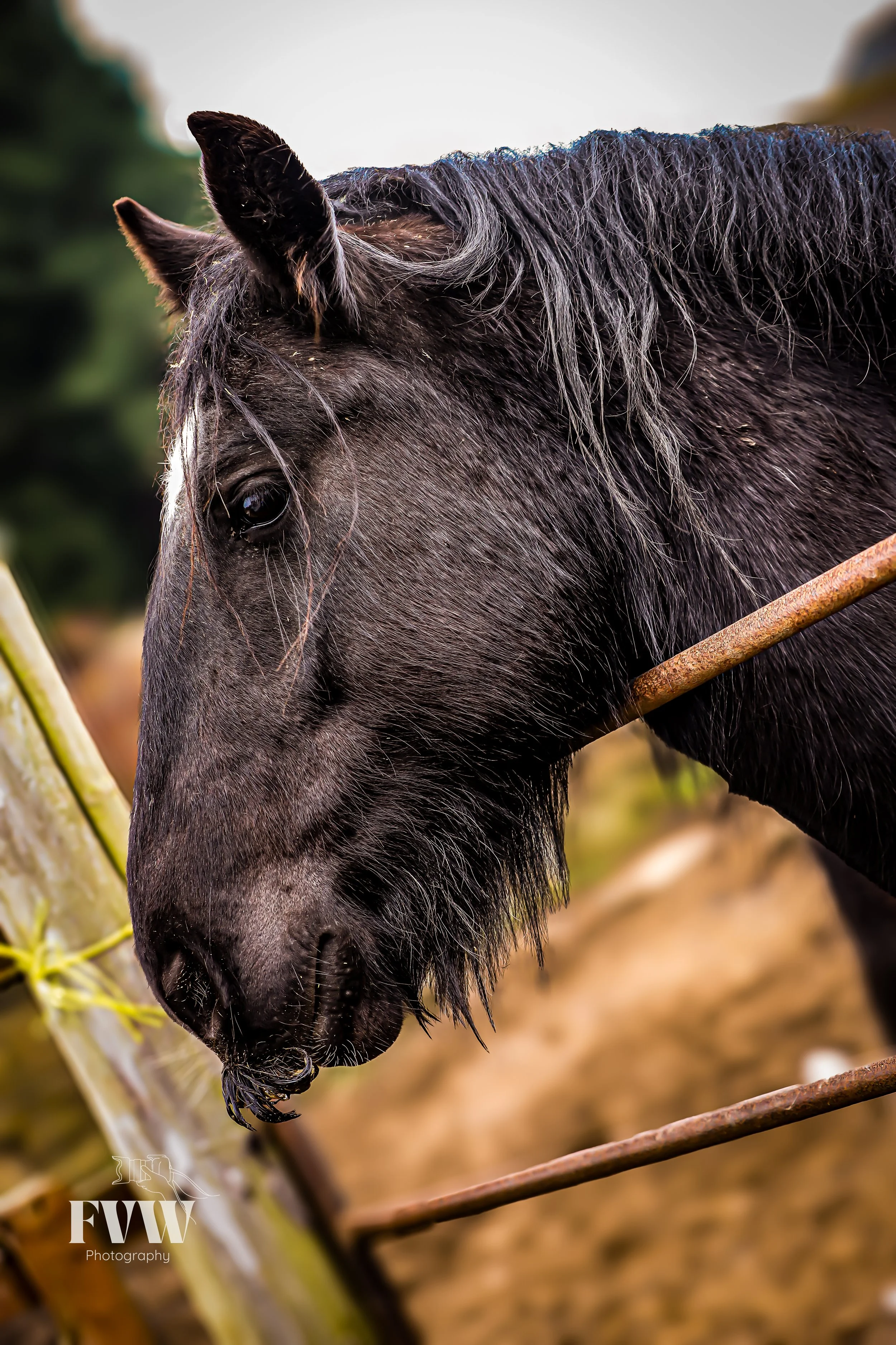 Close-up of a black horse's head behind a fence with a blurred outdoor background.