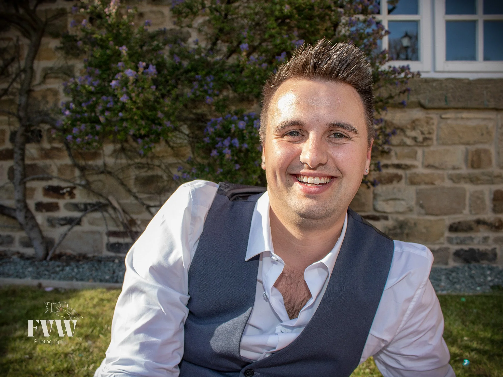 A young man with short gray hair, wearing a white shirt and gray vest, smiling outdoors in front of a stone wall and flowering shrub.