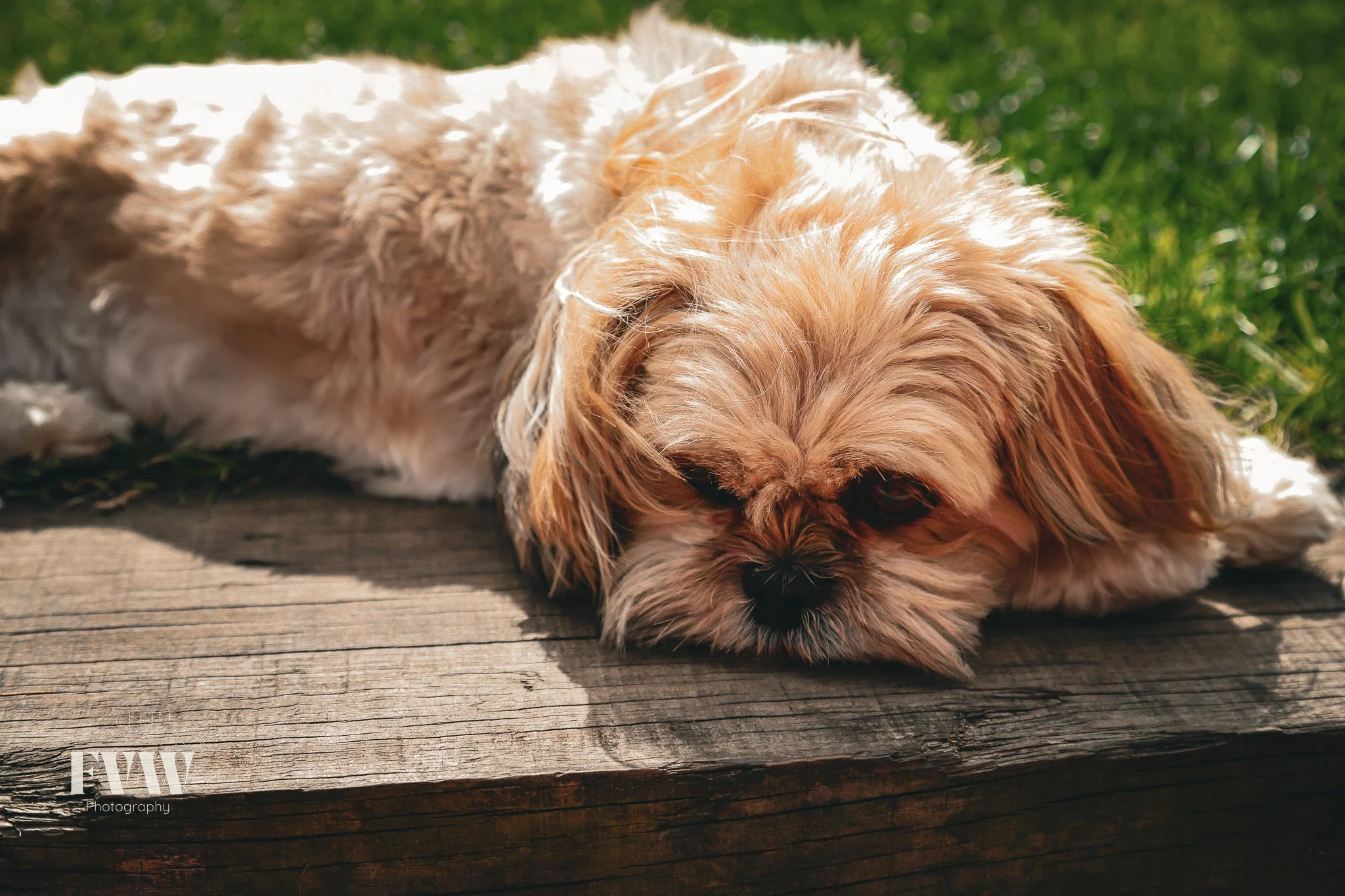 A small, fluffy dog lying on a wooden surface with a grassy background.