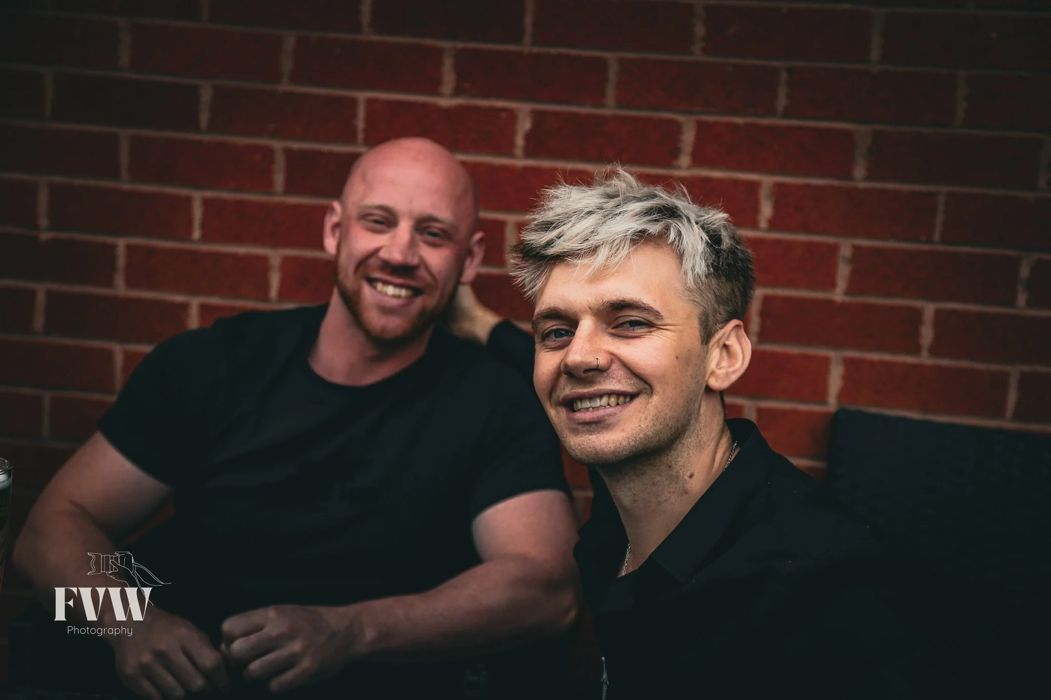 Two smiling men sitting against a brick wall, one with a shaved head and the other with blonde hair and a nose ring, captured in a close-up shot.
